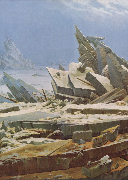 На этом фоне показателен «Северный Ледовитый океан» К. Д. Фридриха. Здесь мы не видим ни аббатства, ни замка, ни явных «руин прошлого» — но перед нами радикальная руинизация будущего: разбитый корабль, раздавленный сплющенными льдинами, и арктический пейзаж, в котором человеческому присутствию не место. Исследователи отмечают, что картина изначально задумывалась как образ «северной природы во всей красоте её ужаса» и впоследствии интерпретировалась как аллегория окончательного крушения человеческих и политических надежд.