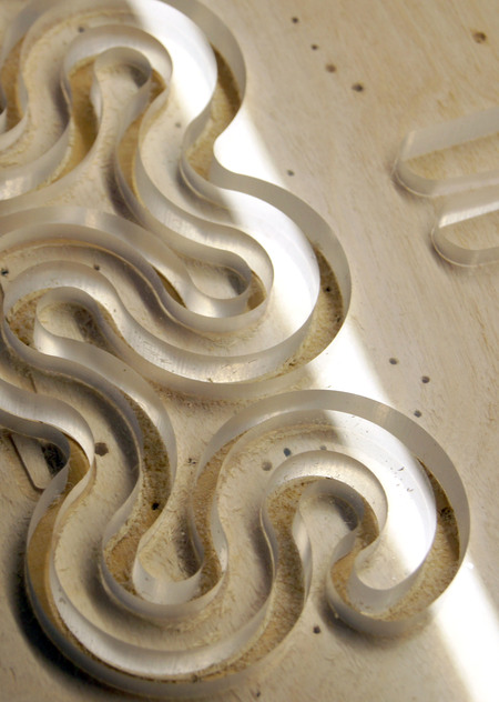 The trellis is cut from a single sheet of transparent acrylic on a milling machine.