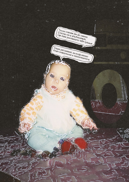 Сочетание эффектов (глитч, цветокоррекция, оффсет, выделение контуров) имитирует кассетный аналоговый формат VHS на экране.