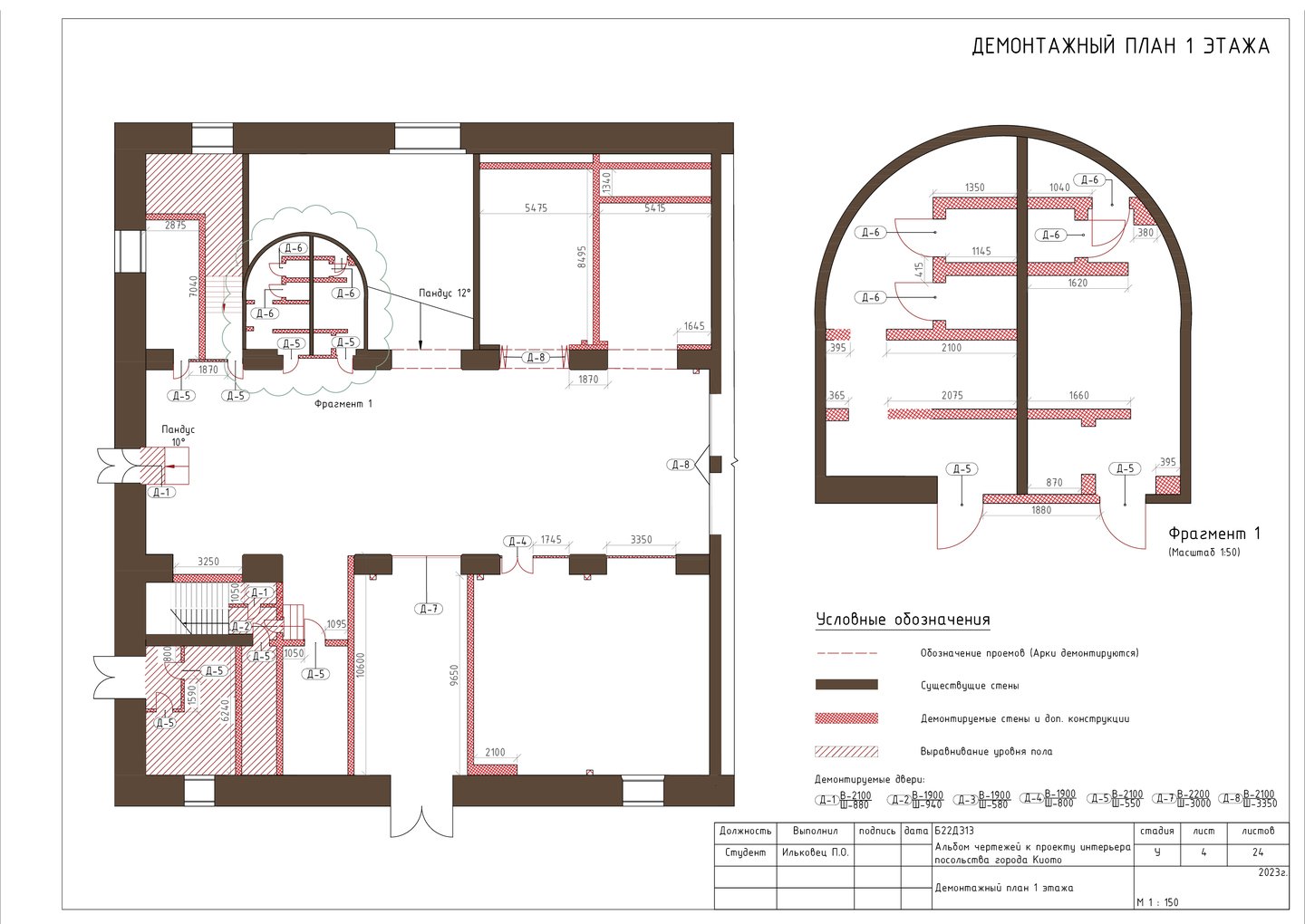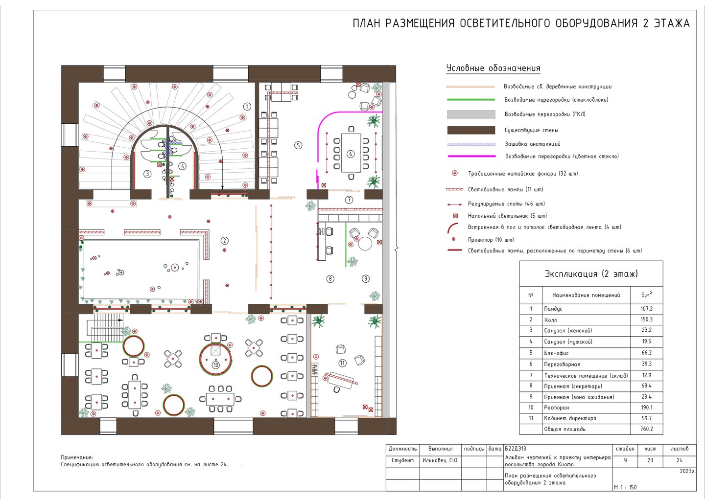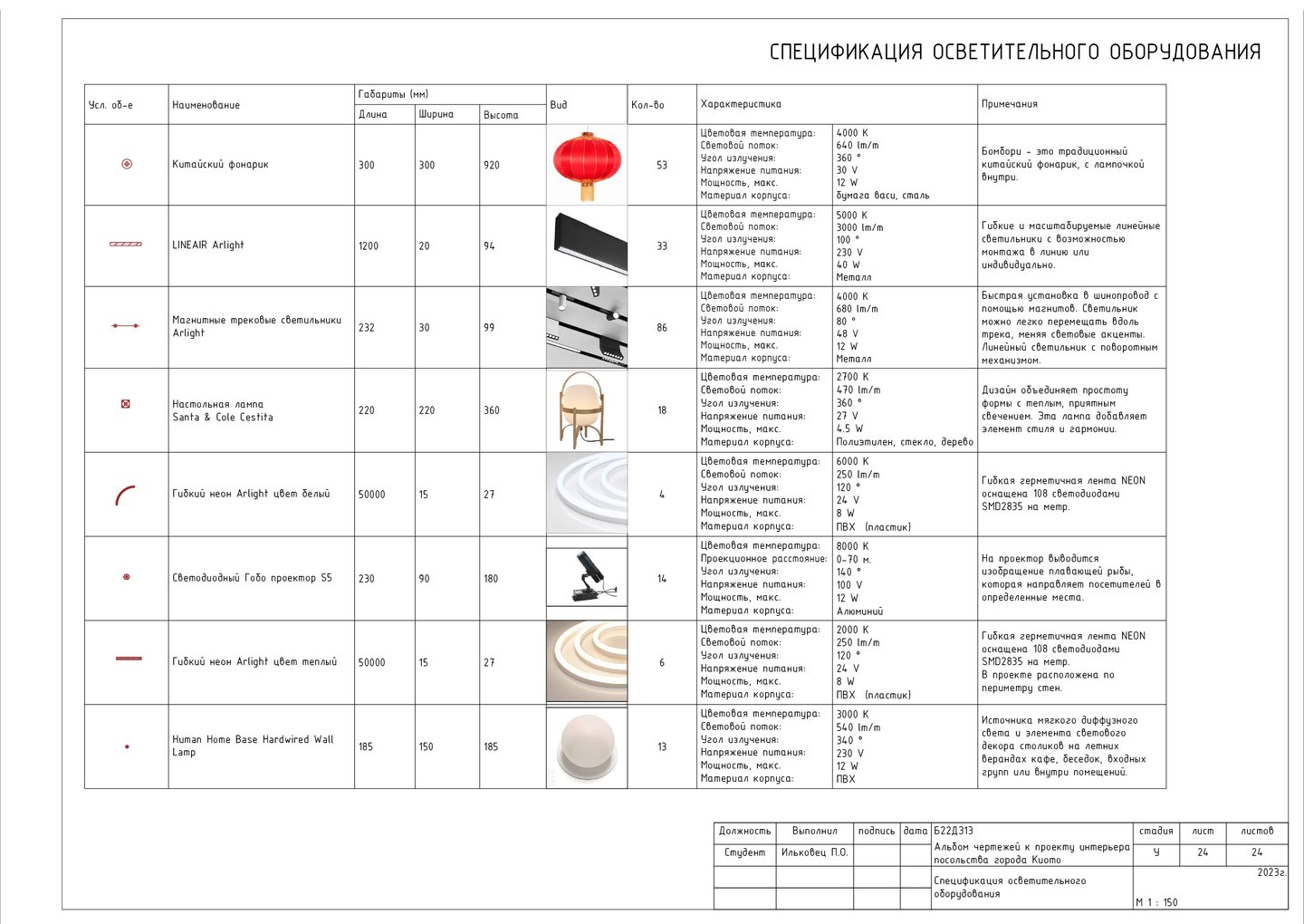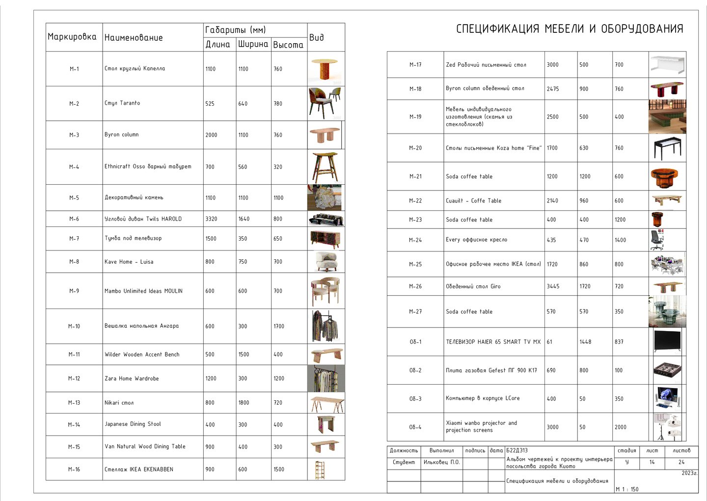 Альбом чертежей к проекту интерьера города КИОТО содержит в себе комплект чертежей, отражающий основную информацию об интерьере и его содержимом: изначальный объект, демонтаж, возведение стен, их обшивка, габаритные схемы оборудования и мебели индивидуального изготовления, планы расстановки и спецификации мебели, света и декораций.