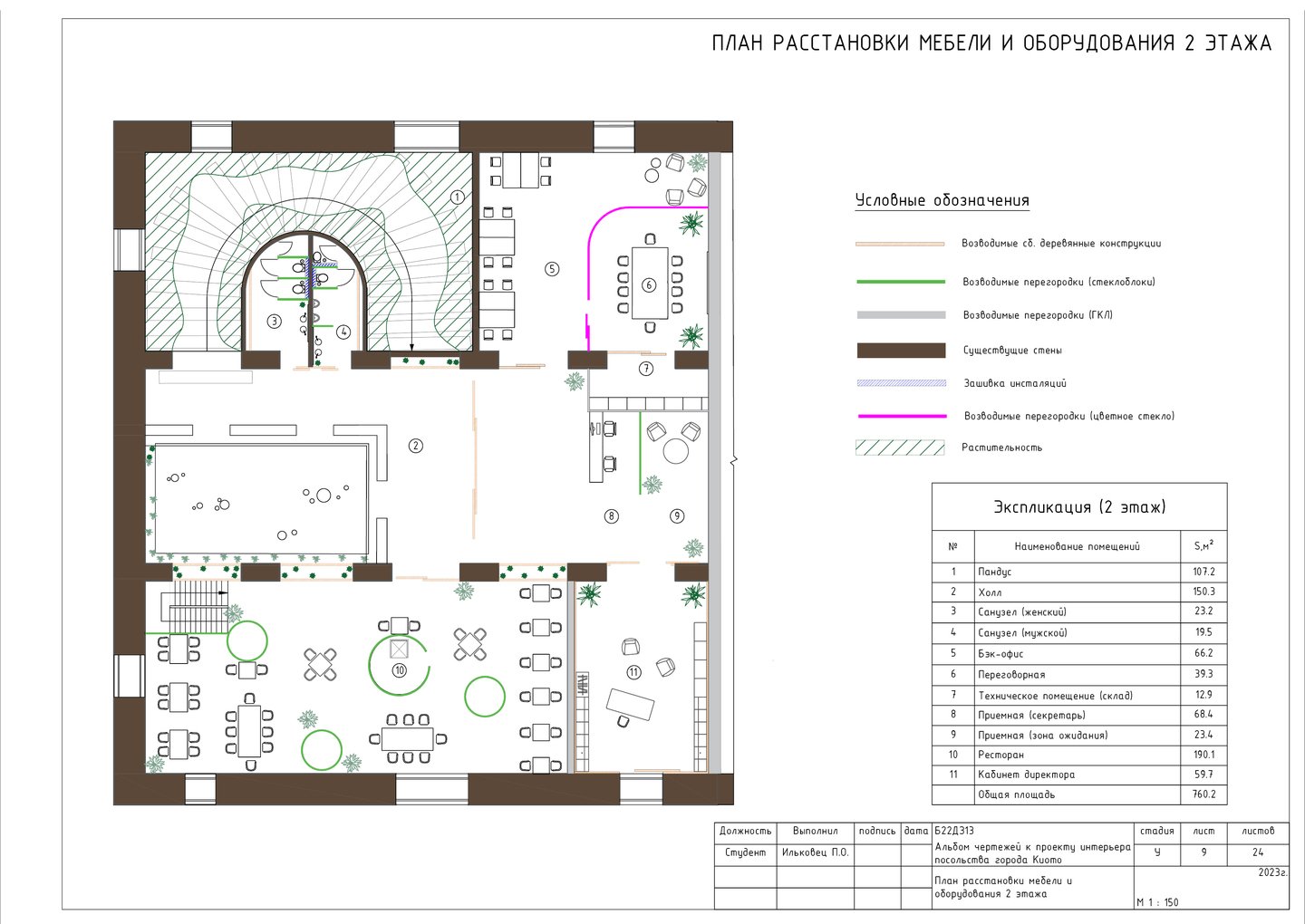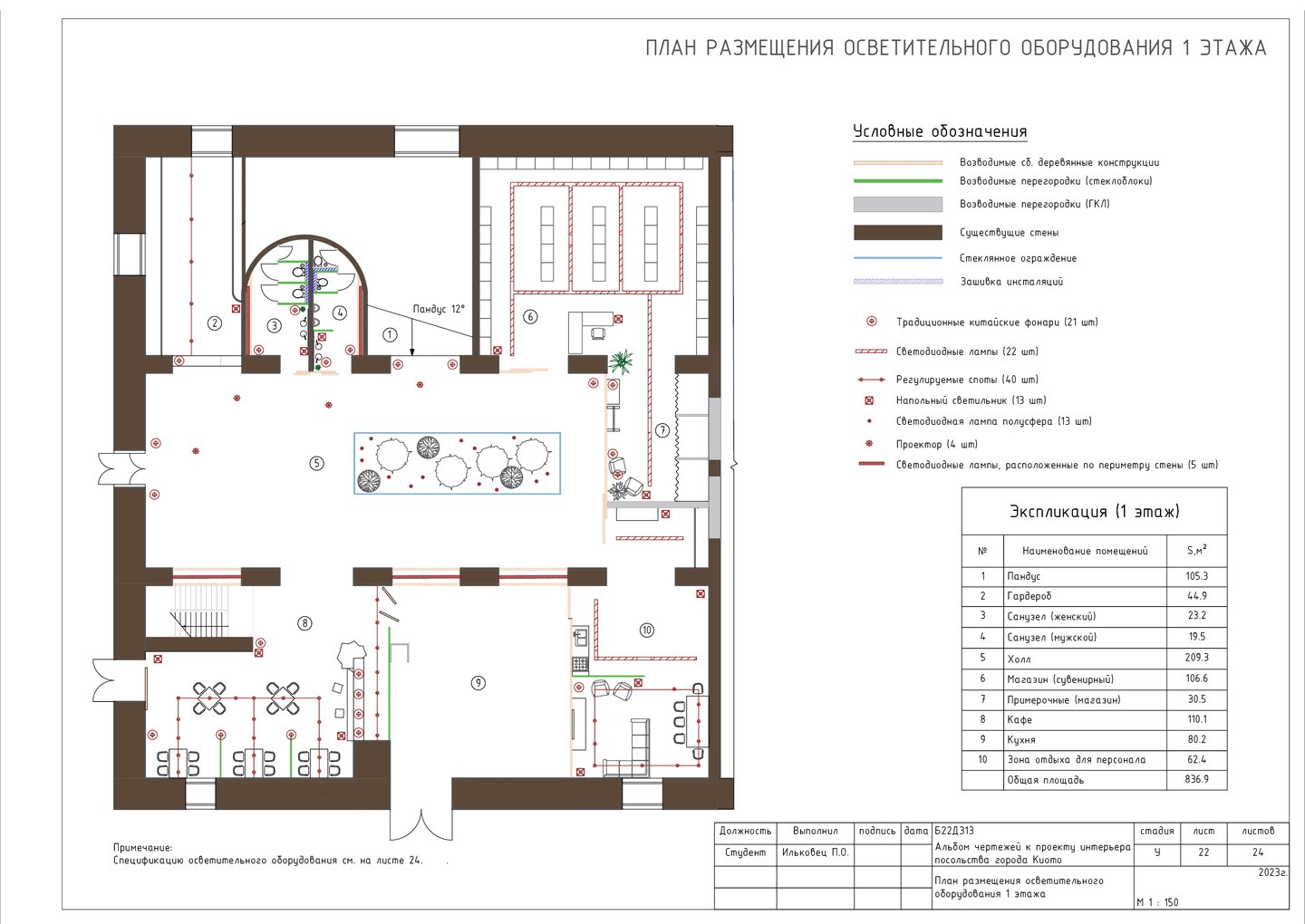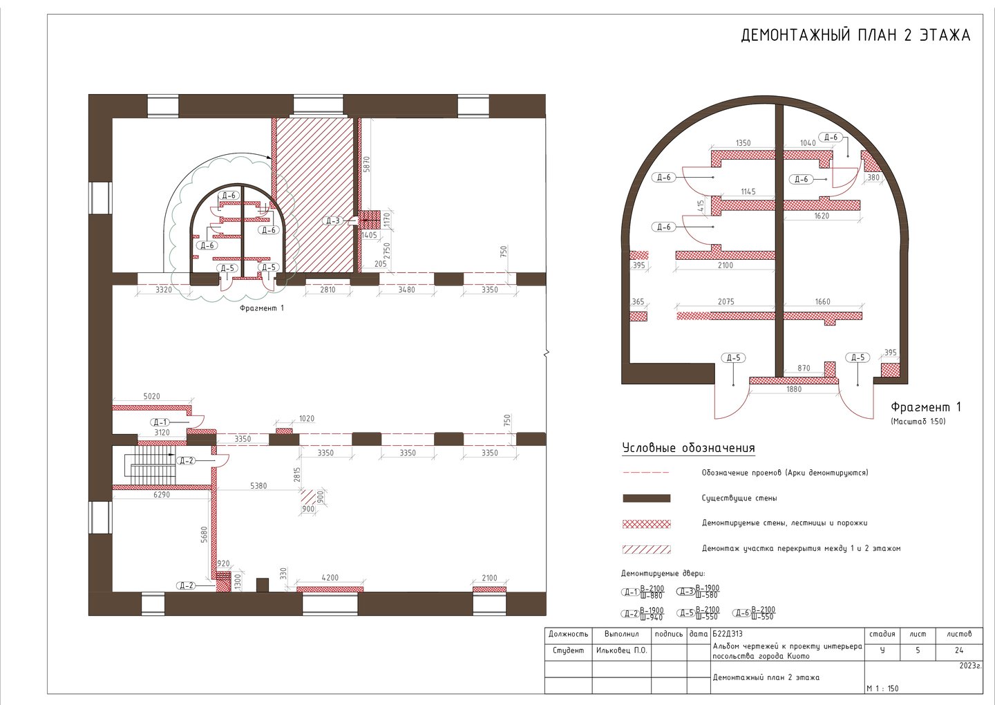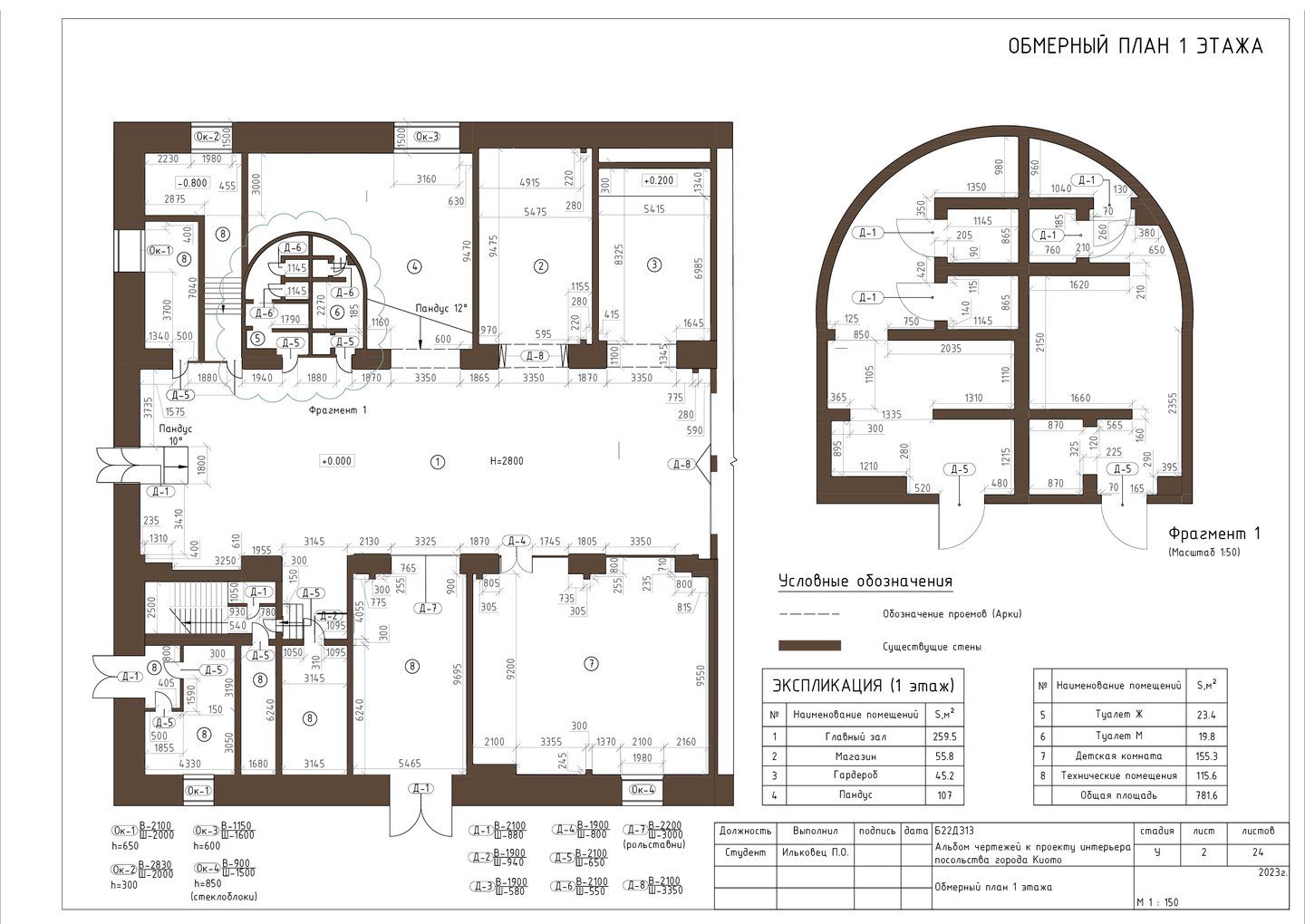 Альбом чертежей к проекту интерьера города КИОТО содержит в себе комплект чертежей, отражающий основную информацию об интерьере и его содержимом: изначальный объект, демонтаж, возведение стен, их обшивка, габаритные схемы оборудования и мебели индивидуального изготовления, планы расстановки и спецификации мебели, света и декораций.