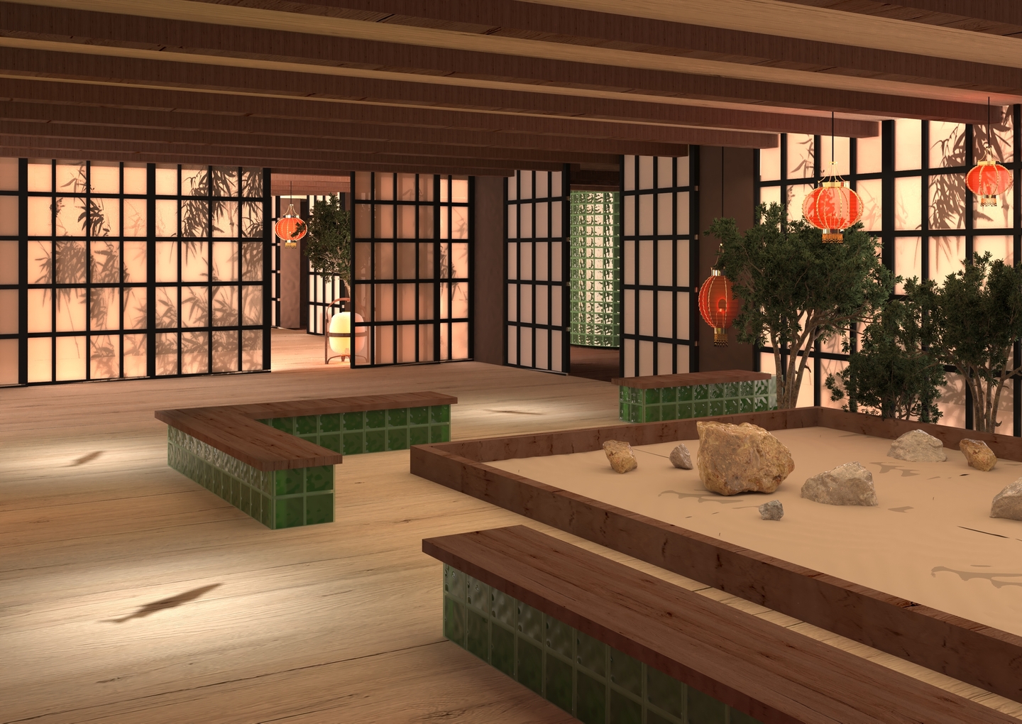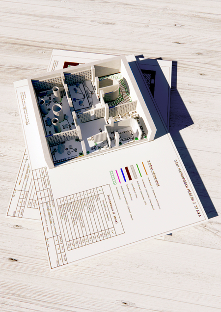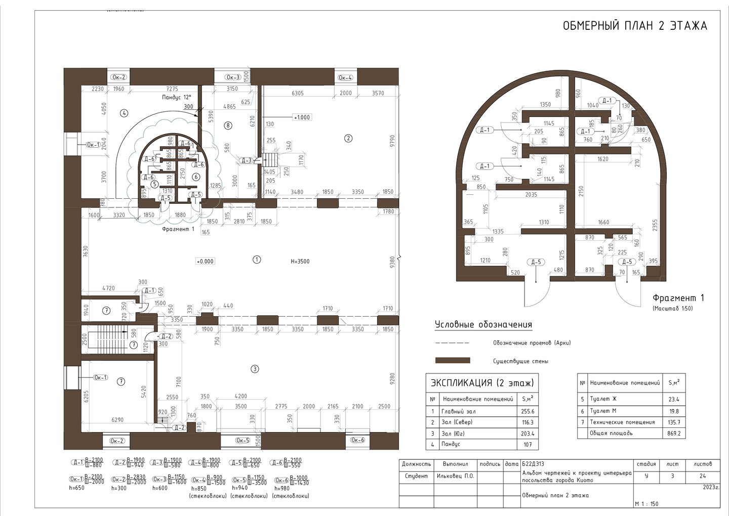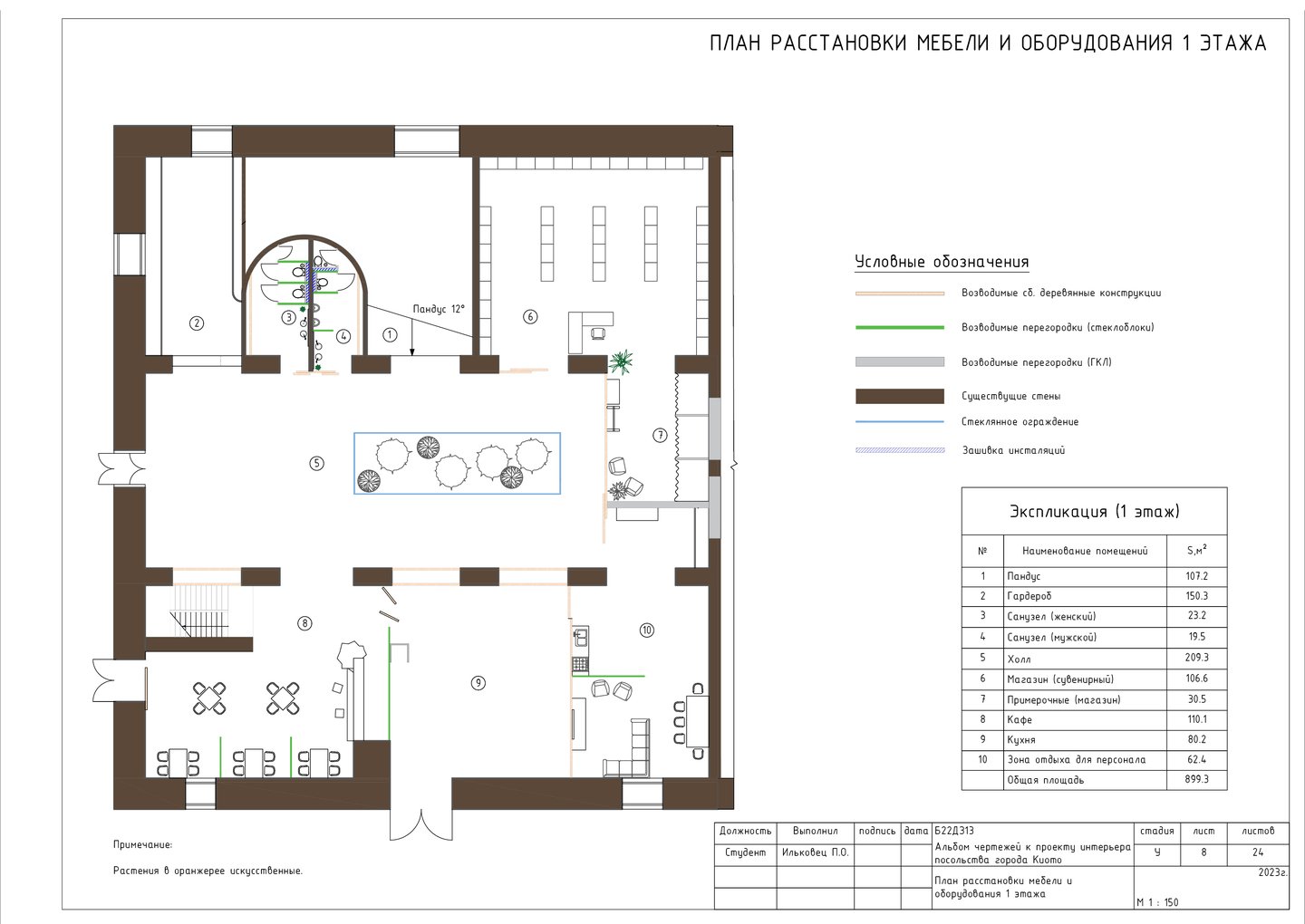 Альбом чертежей к проекту интерьера города КИОТО содержит в себе комплект чертежей, отражающий основную информацию об интерьере и его содержимом: изначальный объект, демонтаж, возведение стен, их обшивка, габаритные схемы оборудования и мебели индивидуального изготовления, планы расстановки и спецификации мебели, света и декораций.