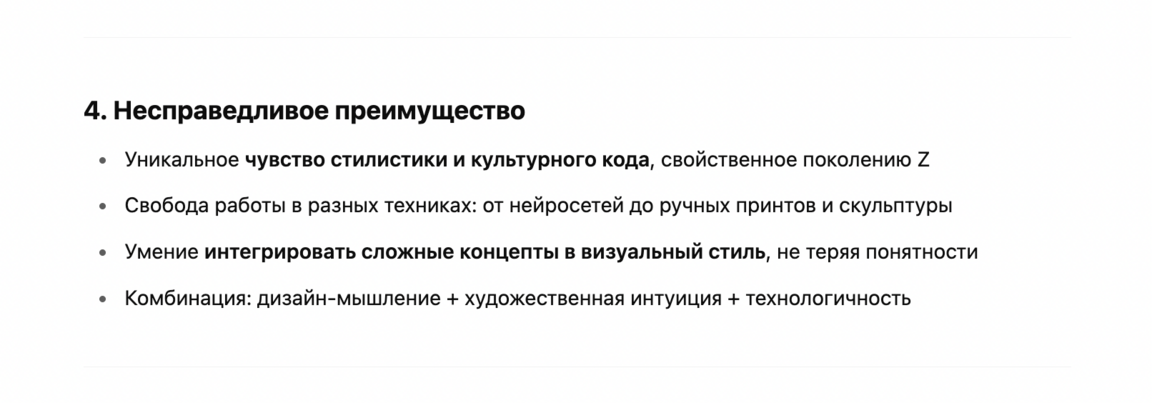4. Предложи мое несправедливое преимущество, которое сложно скопировать или превзойти, основываясь на моем уникальном стиле и подходах, демонстрируемых в портфолио.
