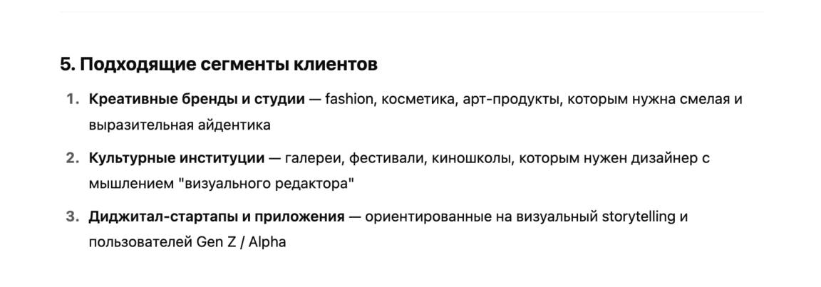 5. Определи 2-3 наиболее подходящих сегмента клиентов (отрасль, размер бизнеса, тип проектов и т. д.), которым мой визуальный стиль и решение проблем подойдут лучше всего. Обоснуй свой выбор, опираясь на визуальные характеристики портфолио.