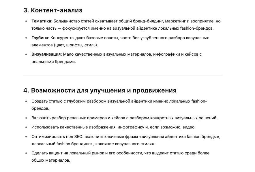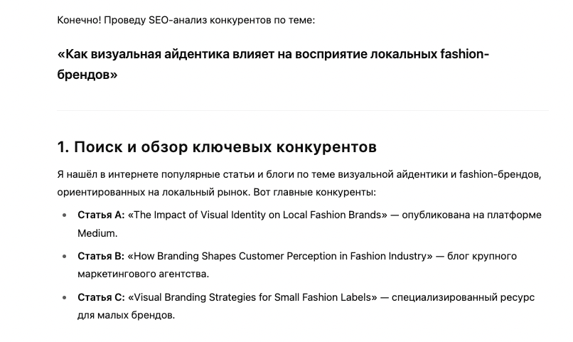 1. Проведи конкурентный анализ статей с той же целевой аудиторией что и у меня (на основе портфолио) 2. Придумай тему и структуру для статье, к которой можно было бы привести в пример мой проект PHYGITAL 3. Сделай отдельный SEO-анализ конкурентов по теме «Как визуальная айдентика влияет на восприятие локальных fashion-брендов» 4. Включи в статью низкочастотные SEO-запросы 5. Учитывай при анализе аудиторию таких платформ как vc.ru и дзен 6. На основе анализа напиши полноценную статью 7. Подготовь вариант этой статьи для Дзена и vc.ru 8. Проверь, что статья для vc.ru по стилю напоминает человека, а не нейросеть и, при необходимости, скорректируй