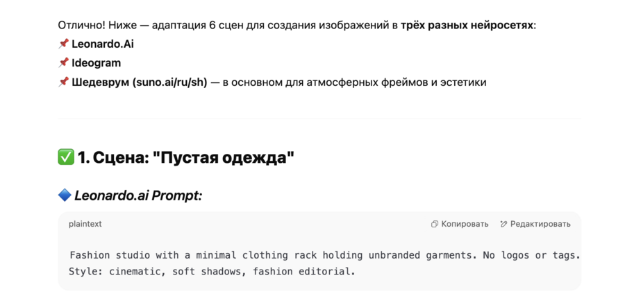 С помощью ChatGPT была выбрана идея, которую я хочу донести: брендам (в частности локальным fashion-брендам) необходимо думать не только об одежде, но и визуальной составляющей — айдентике. Были проанализированы платформы, на которые я планировала выложить видео, их ца и тренды.