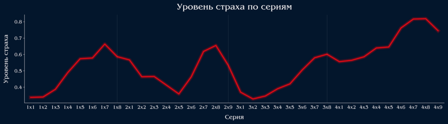 Из графика видно, что уровень страха постепенно нарастает к финалам сезонов и затем снижается в начале следующих, при этом в четвёртом, самом напряжённом сезоне это снижение выражено гораздо слабее и общее напряжение держится почти на одном уровне.