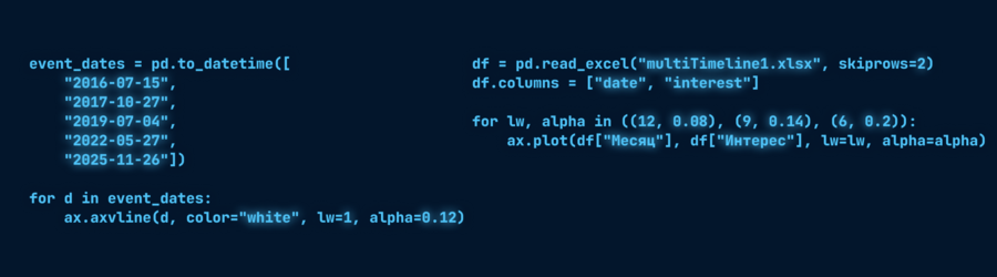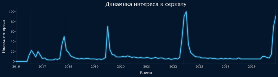 Сначала я взяла данные Google Trends, привела их в удобный для анализа вид и построила временной график. Для наглядности я отметила вертикальными линиями даты выхода сезонов. По графику хорошо видно, что пики интереса почти всегда совпадают с выходом новых сезонов.