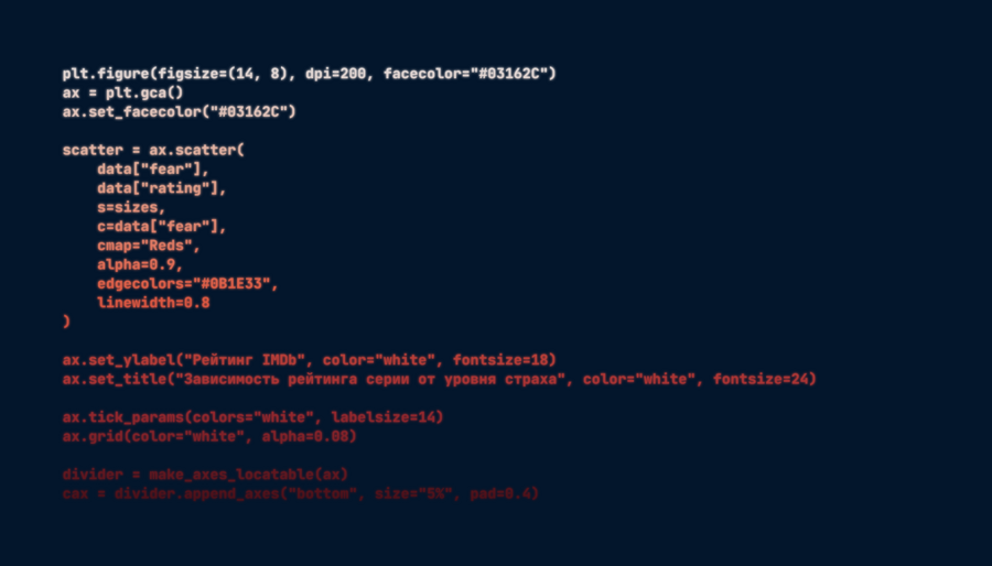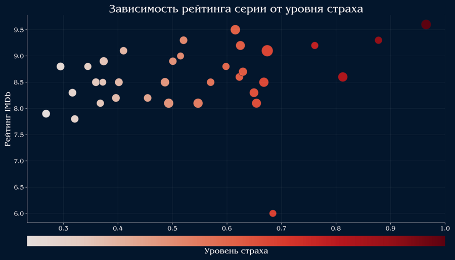 Я использовала пузырьковую диаграмму, чтобы визуализировать зависимость рейтинга серии от уровня страха.
