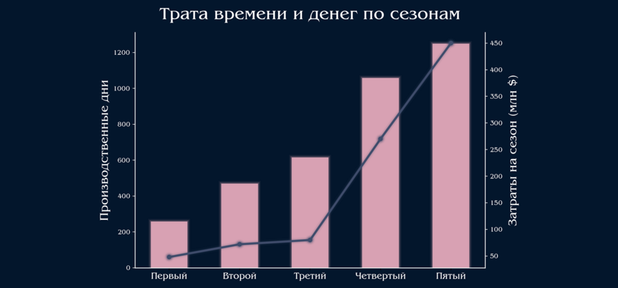 В этом графике я решила наглядно сравнить, как менялись затраты времени и денег на производство сериала от сезона к сезону.