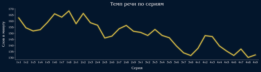 По графику можно сделать вывод о том, что к концу сериала темп речи постепенно снижается. В поздних сериях персонажи в говорят медленнее, чем в начале, что создаёт ощущение более тяжёлого и напряжённого ритма повествования.