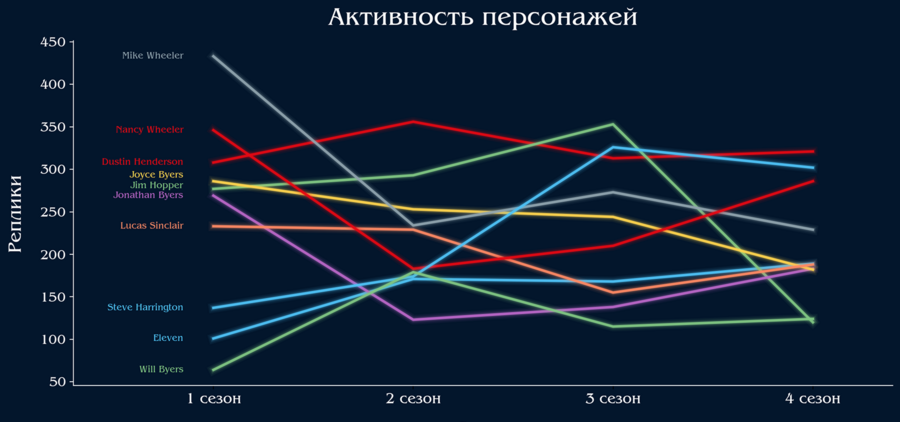 Этот график показывает, как менялась активность ключевых персонажей сериала от сезона к сезону. Под активностью понимается количество реплик персонажа, что позволяет приблизительно оценить его роль и значимость в каждом сезоне.
