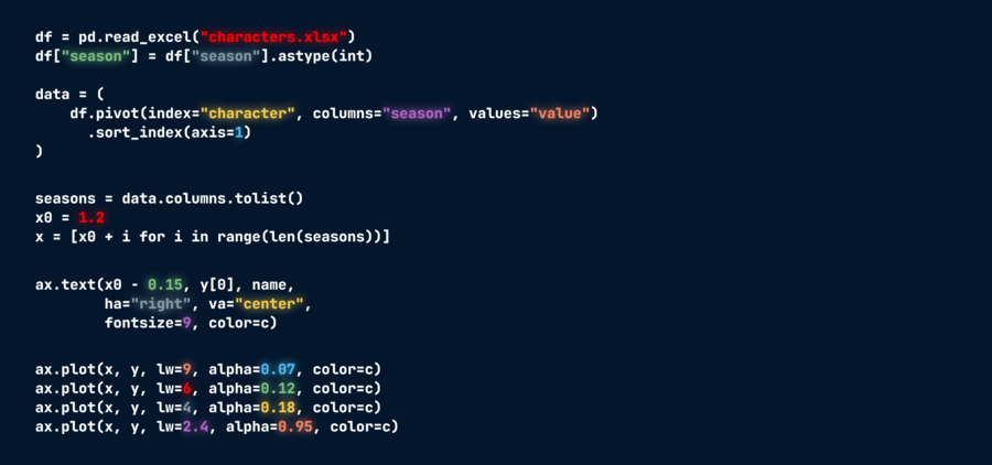 Формат слоупграф был выбран, чтобы наглядно показать динамику изменений. Такой тип визуализации помогает сразу заметить, какие персонажи выходят на первый план, а чья роль со временем снижается.