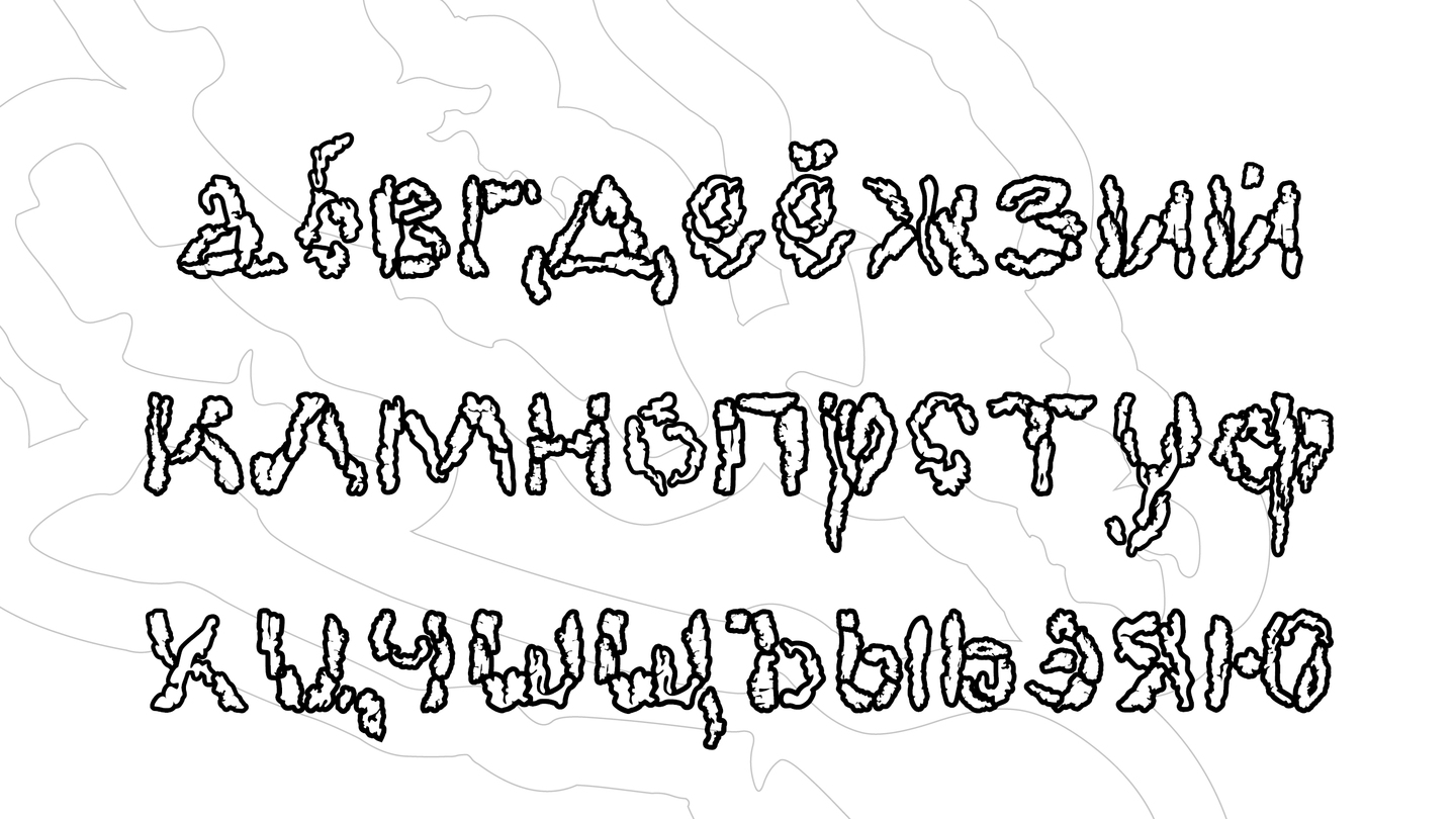 Шрифт составлен из модулей, которые были отрисованы по фотографиям коры разных деревьев: от африканского дерева акокантеры до повсеместно встречающегося дуба. Фотографии для поиска форм были сделаны в Аптекарском огороде
