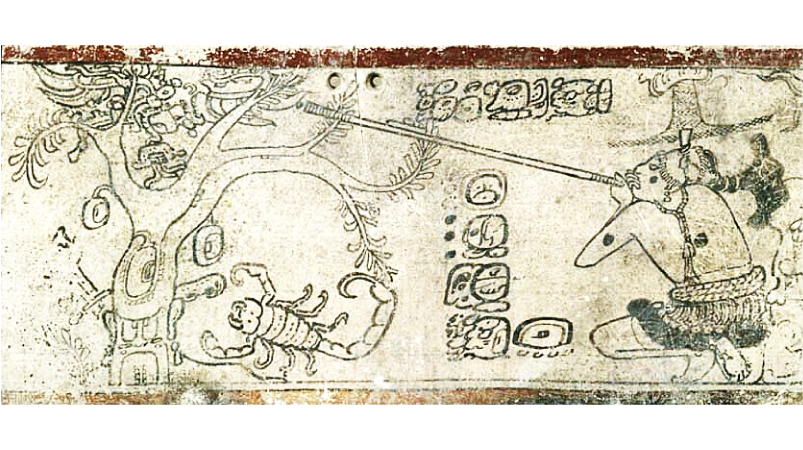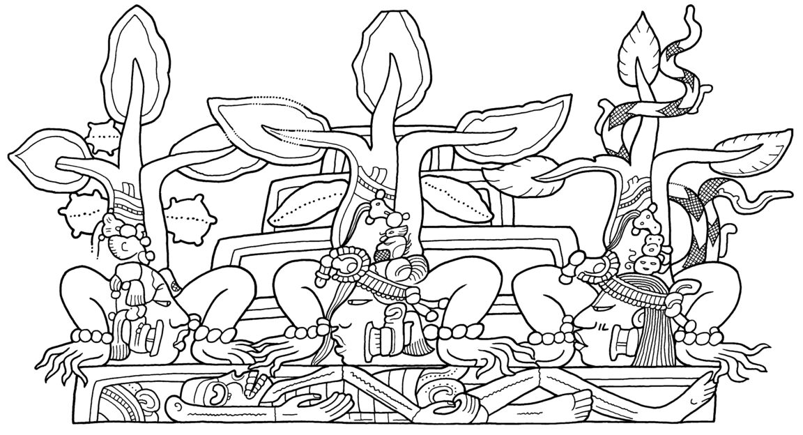 Цари майя стремились отождествить себя с силой Мирового дерева, дарующего жизнь и изобилие их народу. На монументах они часто предстают в виде Древа: вертикальная ось, по которой души нисходят в подземный мир, движутся небесные тела, а Змей Видений приносит им послания от богов и предков. Изображая себя в регалиях Мирового дерева, правители провозглашали себя посредниками между мирами в центральной точке творения. [20, стр. 20-21]