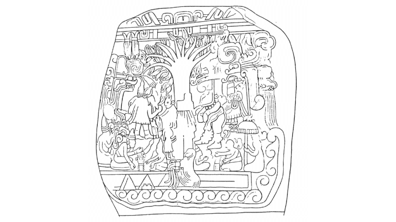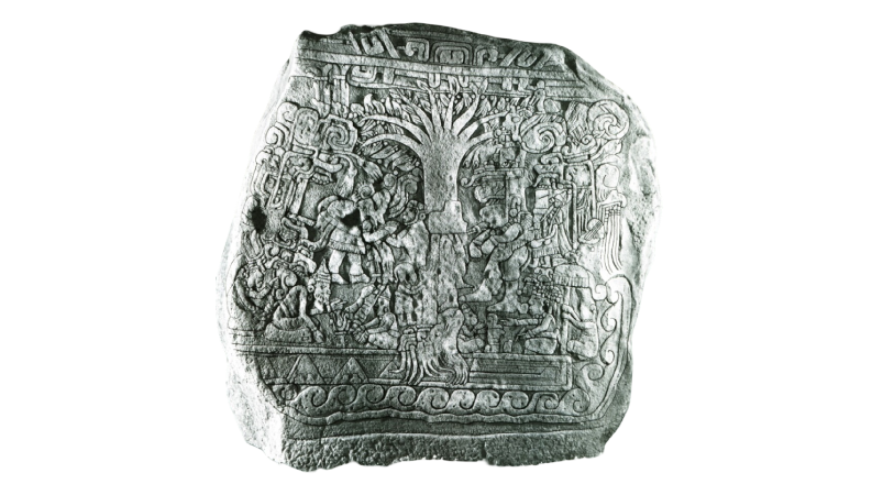 Этот массивный каменный памятник изображает сложную сцену. На нём представлено большое плодоносящее дерево. Корни дерева уходят в вихри воды, что символизирует связь с Подземным миром. Ветви простираются вверх, в небо, где появляются птицы и небесные символы. Различные человеческие фигуры сидят вокруг основания дерева, некоторые из них, по-видимому, взаимодействуют с ним или совершают ритуалы. [18]