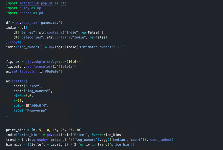 Мое исследование посвящено сбору и анализу данных на площадке Steam. Я рассматриваю определенную категорию — инди. Подразумеваются игры, которые выпущены независимыми разработчиками в небольших студиях. Данные были найдены на Kaggle. Сам датасет затрагивает все игры на площадке, но я взяла именно инди-игры из-за своего направления. Обучаясь на гейм-дизайне, учебные проекты, игры, разрабатываются в небольших группах. Ресурсы в создании игр сильно ограничены. Мне хотелось проанализировать популярный игровой рынок, чтобы лучше узнать: на чем удерживать фокус внимания при разработке небольших игровых проектов. Так, основным вопросом является: