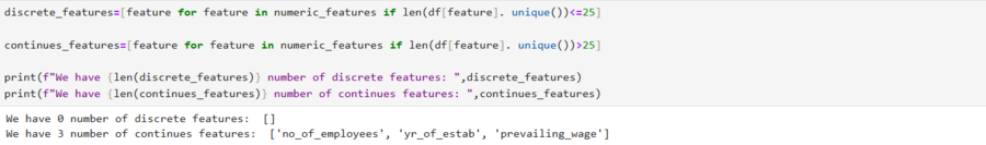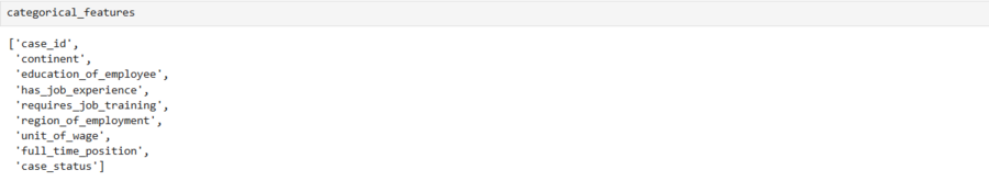 Я также разделила колонки на числовые и категориальные, вывела количество и список числовых и категориальных признаков и после для каждой категориальной колонки показала процентное распределение уникальных значений. Из этого анализа я поняла, что: 1. Столбец user-id нужно удалить, так как он не несет никакой значимой информации. 2. В колонке continent видно, что Азия занимает 66%, значит данные смещены. Нужно объединить все остальные континенты в одну категорию. 3. Столбец unit_of_wage кажется важным, так как большинство значений — годовые контракты.