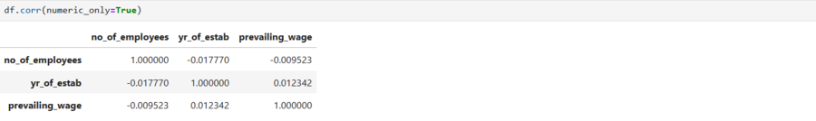 На основе предоставленной тепловой карты корреляции, которая измеряет силу и направление линейной взаимосвязи между тремя переменными, можно сделать следующие инсайты: 1. Отсутствие значимых линейных связей: Наиболее важный инсайт заключается в том, что ни одна из пар переменных (no_of_employees, yr_of_estab, prevailing_wage) не имеет сильной или даже умеренной линейной корреляции. Все коэффициенты корреляции, кроме диагональных единиц (которые показывают идеальную корреляцию переменной с самой собой), очень близки к нулю. 2. Чрезвычайно слабая связь между количеством сотрудников и годом основания: Коэффициент корреляции между no_of_employees и yr_of_estab составляет -0.018. Это указывает на практически полное отсутствие линейной зависимости между возрастом компании и количеством ее сотрудников. Немного отрицательное значение означает, что едва заметная тенденция к меньшему количеству сотрудников может наблюдаться в более старых компаниях, но эта связь настолько слаба, что ею можно пренебречь. 3. Отсутствие связи между зарплатой и другими параметрами: Коэффициенты, связывающие prevailing_wage (преобладающая заработная плата) с другими переменными, также минимальны: