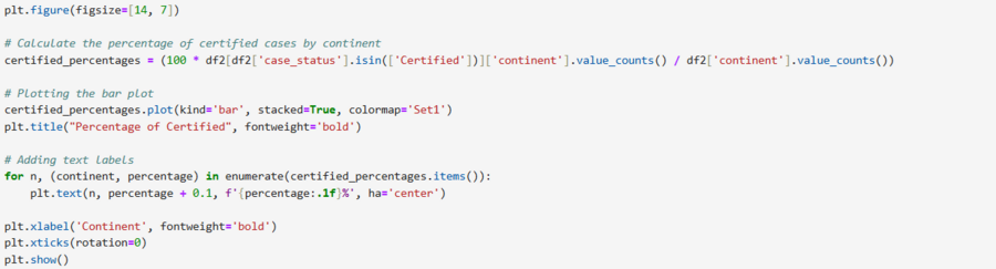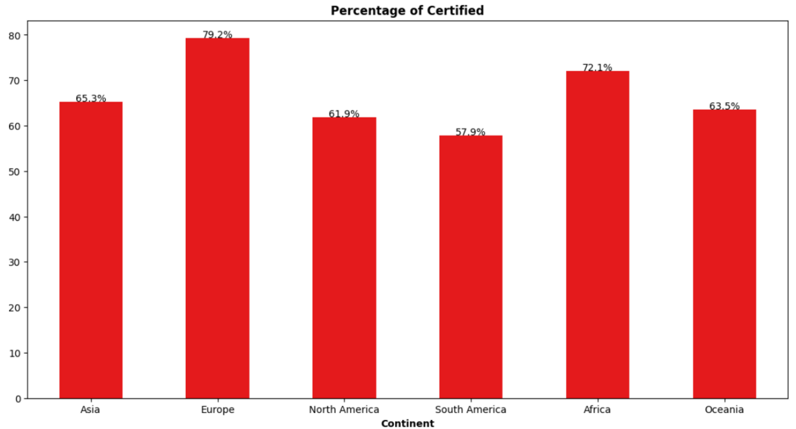 На основе предоставленной таблицы пропорций, детализирующей статус кейса (case_status) в разбивке по континентам (continent), можно выделить следующие ключевые инсайты: 1. Значительные различия в уровне одобрения: Хотя на всех континентах количество сертифицированных кейсов превышает количество отклоненных, существуют заметные различия в пропорциях между регионами. 2. Самый высокий уровень одобрения: Европа имеет самый высокий процент одобрения — 79,23% кейсов сертифицированы. Это значительно выше, чем в среднем по всем континентам. 3. Самый низкий уровень одобрения: Южная Америка имеет самый низкий уровень одобрения — 57,86% сертифицированных кейсов и самый высокий процент отказов (42.14%). 4. Африка — второй по уровню одобрения: Африка занимает второе место с высоким показателем одобрения в 72,05%. 5. Азия, Северная Америка и Океания имеют схожие пропорции: Эти континенты демонстрируют средние показатели одобрения, близкие к общему среднему значению по всему набору данных (около 62% — 66%). 6. Северная Америка и Южная Америка имеют самые высокие показатели отказов: В этих регионах процент отклоненных кейсов самый высокий (38.12% и 42,14% соответственно).