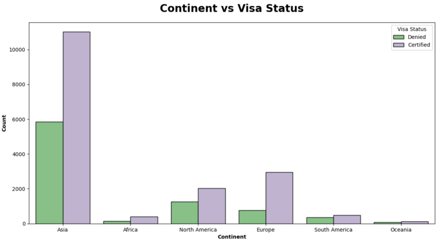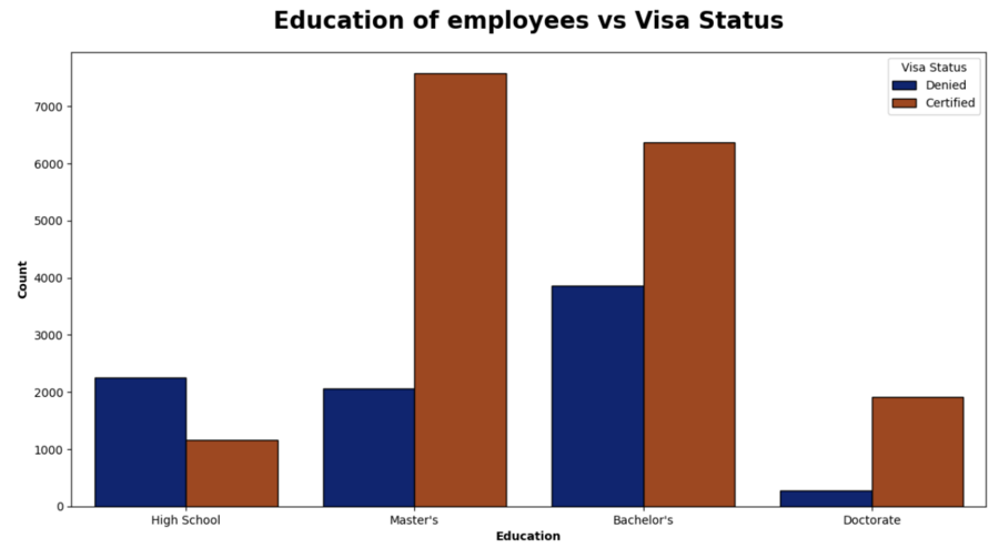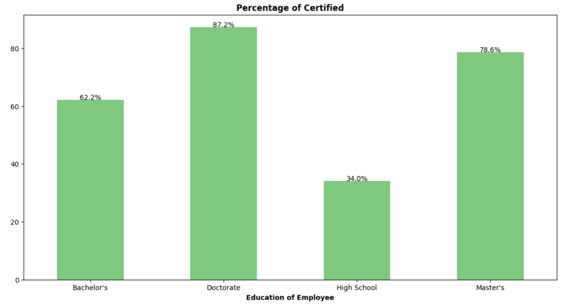 Существует сильная положительная связь между уровнем образования и вероятностью получения сертифицированного визового статуса. Чем выше уровень образования, тем выше вероятность одобрения визы и ниже вероятность отказа.