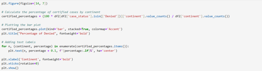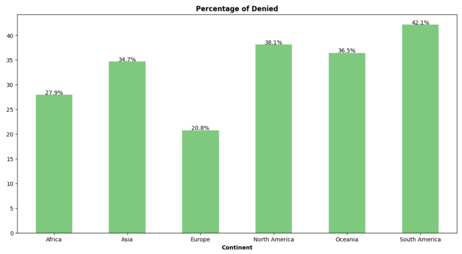 Теперь посчитаем процентное распределение статусов визы по каждому континенту. Сначала составила небольшую таблицу с данными, а после графики, где сначала все вместе скомбинированно, а потом отдельно расмотренны отказанные и одобренные статусы.