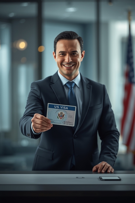 Также для обложки я использовала LeonardoAI. Промпт: A professional, realistic illustration of a man in a dark business suit standing behind a desk and smiling warmly while handing over an approved U.S. visa document. The visa clearly shows an approval stamp but no readable personal data. The man looks friendly and trustworthy. The background is a modern, clean office with subtle American elements (a blurred U.S. flag or neutral blue tones), soft natural lighting, high detail, realistic style, corporate and professional atmosphere, vertical composition, sharp focus, photorealistic, no text, no logos.