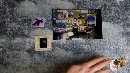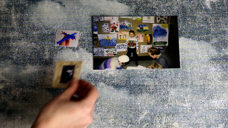 Для визуального ряда я сделала видео, в котором я без репетиции и сценария выкладываю на холст бумажки, которые нахожу в своей коробке с вырезками для коллажа. Холст — найденная на барахолке выцветшая напечатанная картина с небом и морем. На нем есть дыра, и я пытаюсь этими вырезками прикрыть эту дыру, сделать какой-то красивый коллаж, но получается так себе.