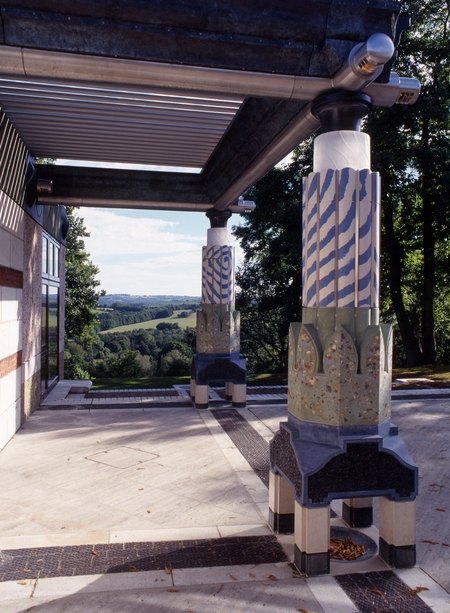 Колонны Аутрама отлиты из бетонной смеси с добавками дробленого кирпича и стекла, отполированы и покрыты орнаментом, благодаря чему бетон приобретает неожиданный декоративный эффект. Архитектор сочетает цветные индустриальные материалы с классическими формами: капители его колонн стилизованы под пламя или лотос, выполнены из керамических плиток, фризы покрываются пестрой росписью. Эти полихромные и техно-материальные интерпретации классики ярко демонстрируют, как изменение материала обновляет цитату. Аутрам доказал, что даже бетон и металл могут передавать «мифологическое послание» классической архитектуры, если насытить их орнаментом и символикой. Его здания — красочные, словно игрушечные храмы — стали иконами постмодернизма, показывающими силу материального переосмысления ордера.