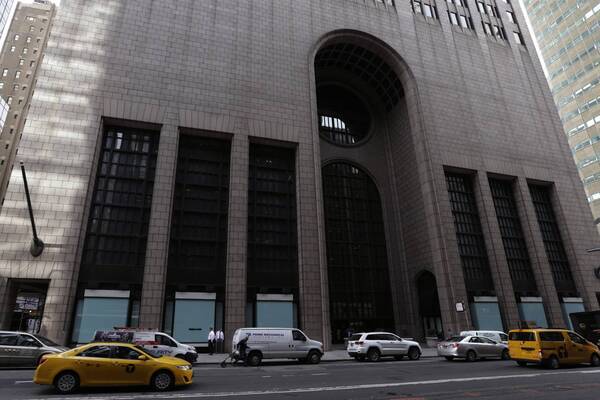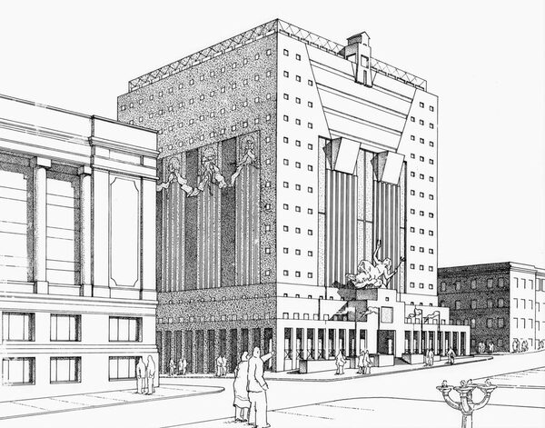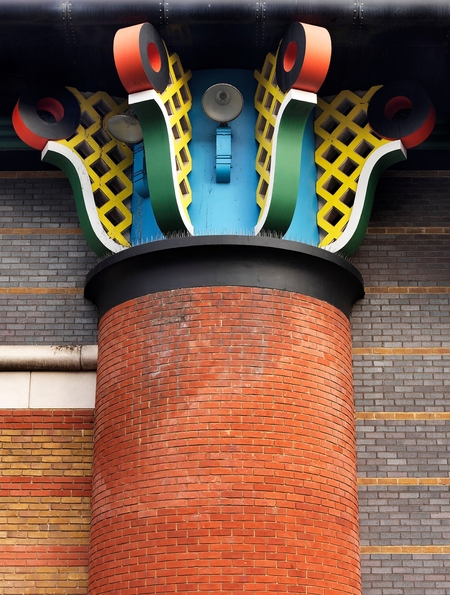 Фасад этой постмодернистской постройки поначалу повторяет ритм и ордер классического здания, но постепенно «растворяется»: колонны редеют, антаблемент теряет слои — карниз исчезает вовсе, и к углу здания декор сходит на нет.