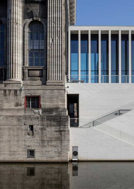 В новом здании Галереи Джеймса Саймона в Берлине ряд таких тонких опор создает эффект абстрагированной колоннады, будто архитектурного макета. Они придают постройке классический ритм, но предельно упрощены, почти плоские и не декорированные.