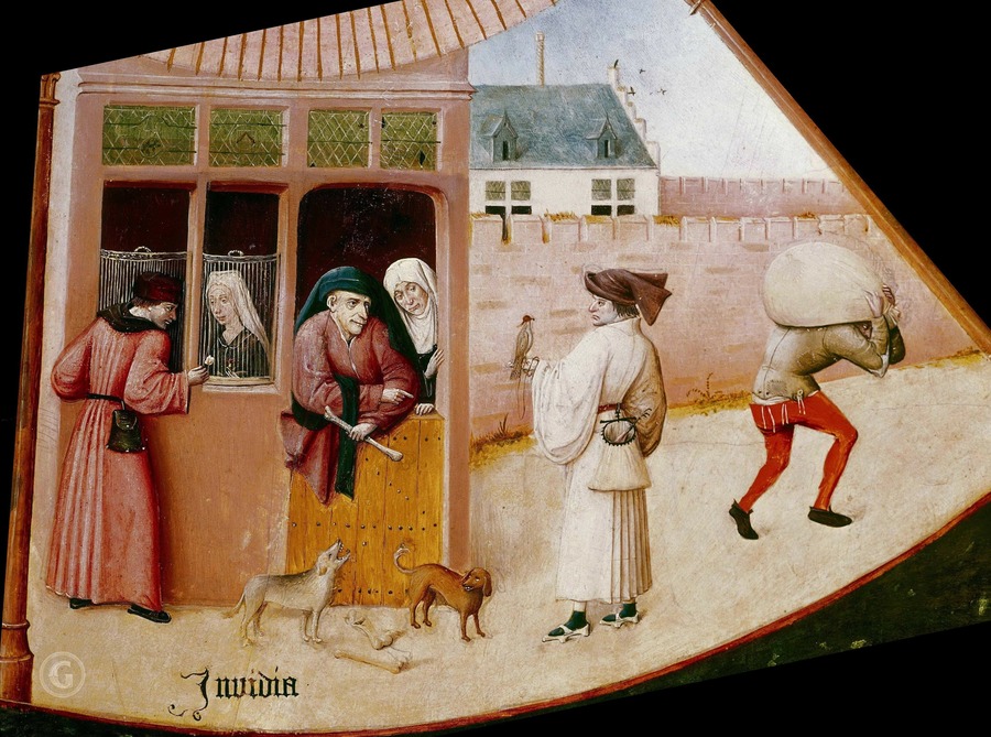 Семь смертных грехов: алчность, зависть, гнев, гордыня, похоть, уныние, чревоугодие. Иероним Босх, «Семь смертных грехов и четыре последние вещи», ок. 1480–1500 гг. — фрагменты