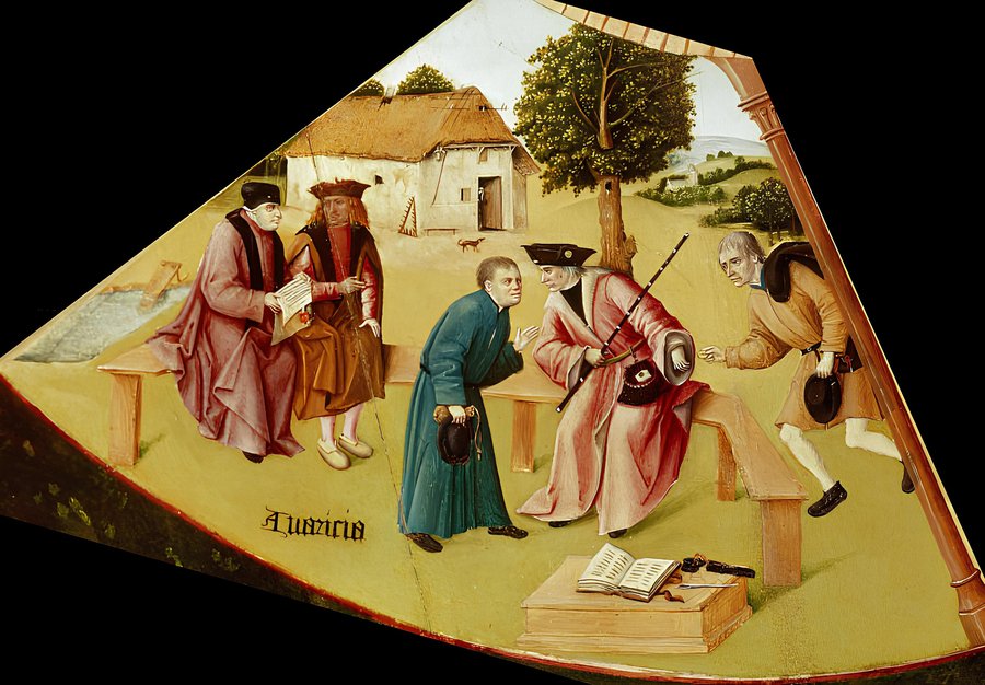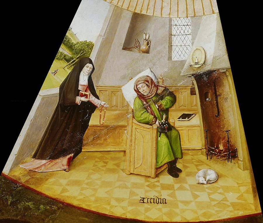 Четыре вещи, через которые проходит человек в конце жизни. Иероним Босх, «Семь смертных грехов и четыре последние вещи», ок. 1480–1500 гг. — фрагменты