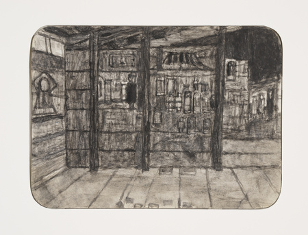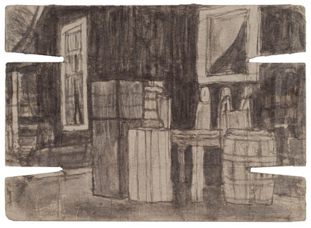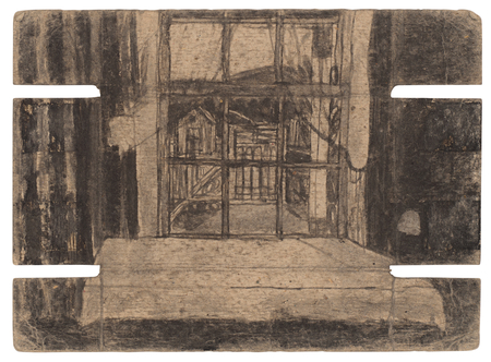 Слева: Джеймс Касл, (Вид из окна / интерьерный вид), ок. 1910–1977 гг.; справа: Джеймс Касл, (Вид снаружи с ящиками и бочкой; на обороте: пейзаж со зданиями), ок. 1910–1977 гг.