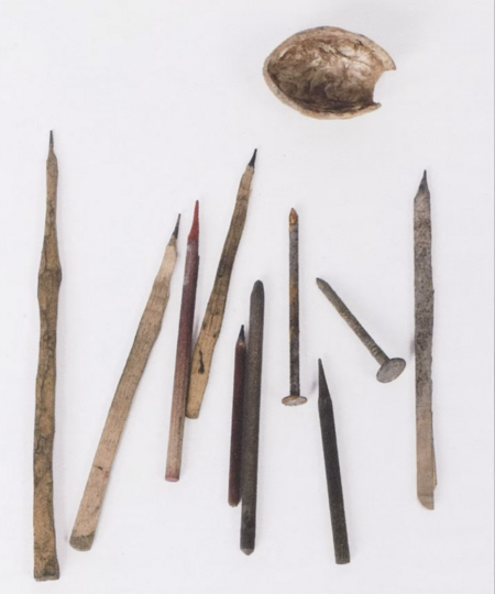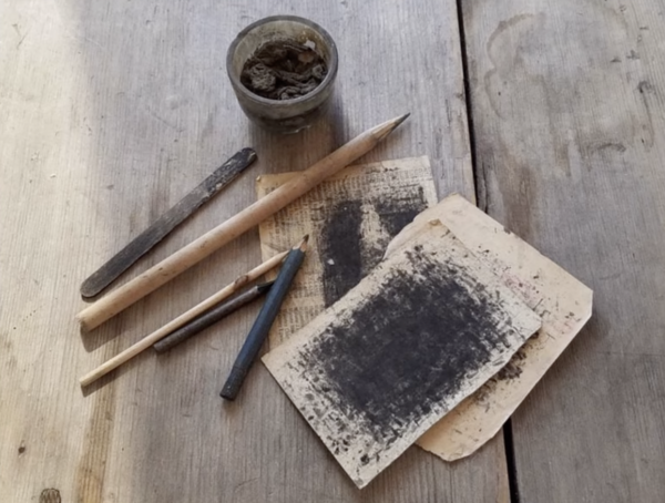 Известно, что Джеймс Касл иногда использовал обычный графитный карандаш. Однако подавляющее большинство его работ было создано с помощью смеси сажи и слюны. Вместо кисти у Касла была заточенная деревянная палочка, которой он наносил линии и тончайшие штрихи. Есть предположение, что в какой-то момент он использовал и собственные волосы, скрепляя их таким образом, чтобы получить подобие кисти. Все эти решения были не художественным выбором, а результатом доступности материалов — он работал тем, что было под рукой.