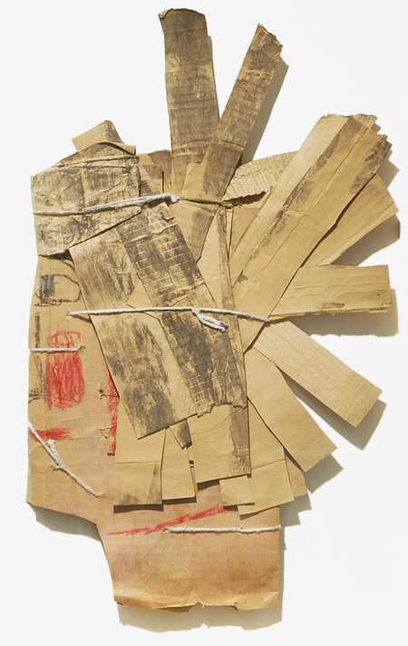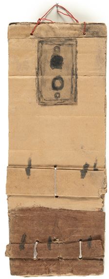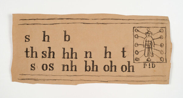 Во-вторых, выбор материалов и техника Касла отражают его изобретательность и адаптивность. Сажа, слюна, палочка вместо кисти, цвет, добытый из подручных предметов, а также использование картонных коробок, обёрток, обрывков бумаги и нитей создают целостную визуальную среду. Эти элементы не только определяли эстетику его произведений, но и становились частью структуры его языка, превращая ограниченные ресурсы в полноценные художественные инструменты.