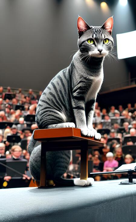 Где обнаружил, что музыканты, увлеченные репетицией, не обратили внимания на то, что администрация куда-то исчезла и не открыла двери для зрителей. Кот быстро запрыгнул на сцену и начал бегать вокруг музыкантов. Однако никто его не замечал каждый смотрел на ноты, инструмент и дирижера. Поэтому он устремился к мужчине во фраке, который размахивая палочкой, управлял всеми этими музыкантами. Сперва тот тоже его игнори ровал, но когда кот лег на пол рядом с ним и начал ворочаться на спине, дирижер, наконец-то обратил внимание: «О, это снова ты, ученый кот? Мы тут репетируем, поэтому, пожалуйста не мешай нам». Коту пришлось разными способами еще несколько раз привлечь внимание музыкантов перед тем, как они поняли, что у него есть важная информация для них. Слегка рассерженный дирижер хотел было выдворить кота в коридор, но, открыв дверь, увидел, как там пусто и темно.
