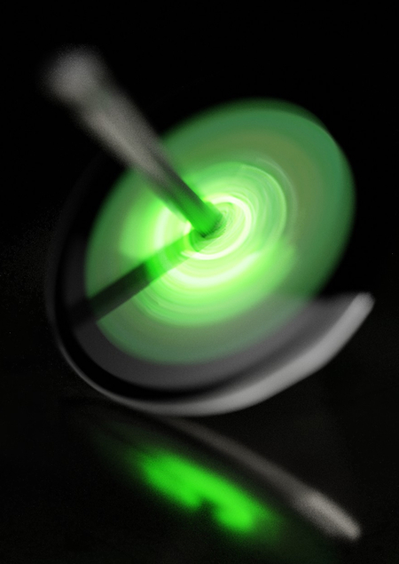 Волчок из серии ЭЛЕКТРОЁЛКА — плоский диск Ø90 мм с большим окном, имитирующим осциллограф Ø80 мм: кольцо микро-LED рисует фигуры Лиссажу.