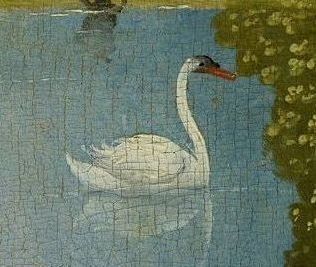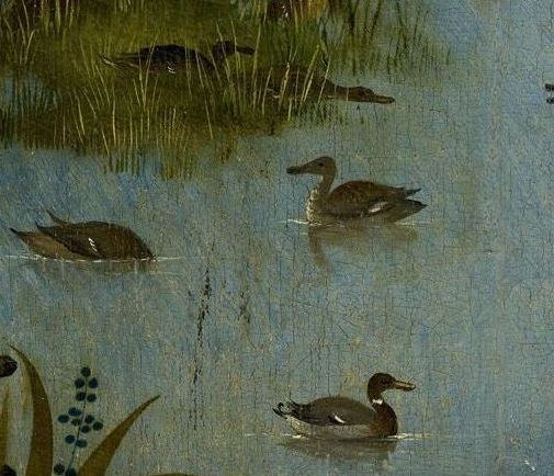 По одну сторону от источника жизни плавают утки, которые в эпоху Босха считались «низшими тварями» из-за своей привычки погружаться в грязь. По другую сторону — величественный лебедь, символ чистоты и знак Братства Богоматери, членом которого художник оставался до конца жизни. Возможно, здесь заложено противопоставление. Однако лебедь движется в том же направлении, что и презираемые земноводные. Поэтому можно предположить и обратное: утки и лебедь вместе олицетворяют райскую терпимость, ведь источник жизни питает и возвышенное, и земное.
