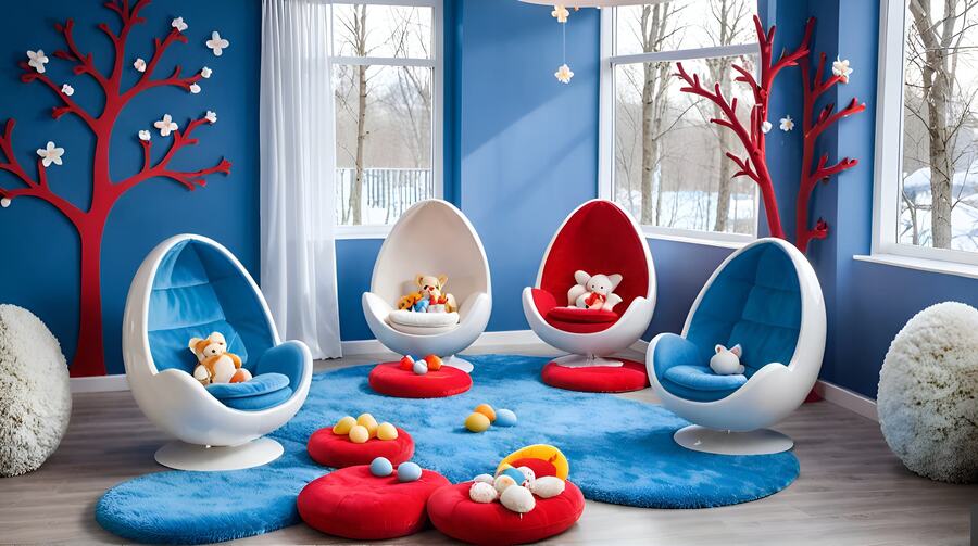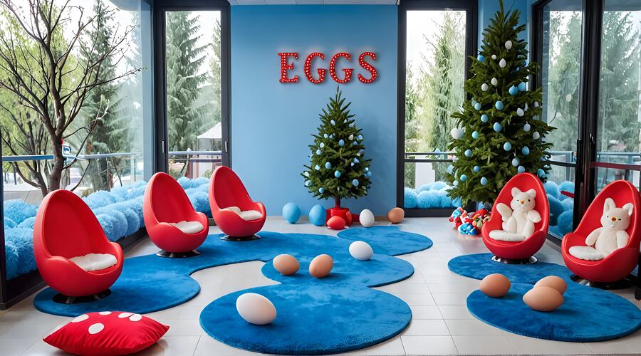 Нейроплод: interior of a shop for kids, fluffy blue carpets with beautiful rubber toys in the shape of eggs and soft fluffy chairs in the shape of eggs, in red, blue and white colors soft cozy lighting, sun rays, trees around, peaceful atmosphere