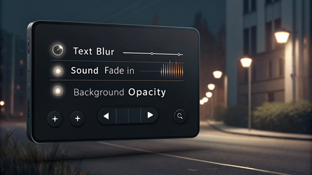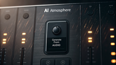 A close-up of a digital tool panel titled «Atmosphere». Sliders with labels: «Blur Intensity», «Grain», «Light Bloom». A button «Generate with AI» glows softly. Below, small thumbnails of AI-generated mood images: abstract rain, light trails, fog, dust particles. Dark UI with subtle neomorphism. --ar 16:9