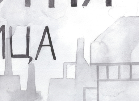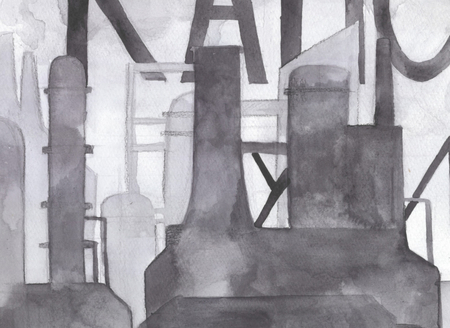 Заводы и густой смог формируют плотный, давящий пейзаж. Табличка фиксирует промышленную зону как постоянный источник экологической нагрузки.