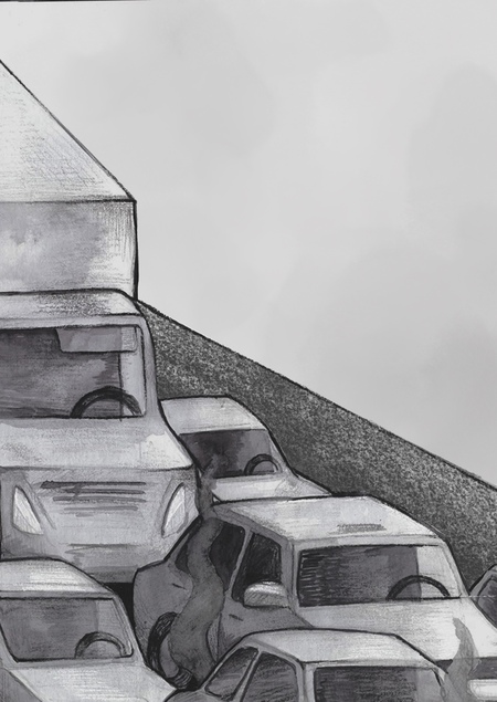 Дорога с вечной пробкой становится источником смога: выхлопы машин окрашивают пространство в серые тона.