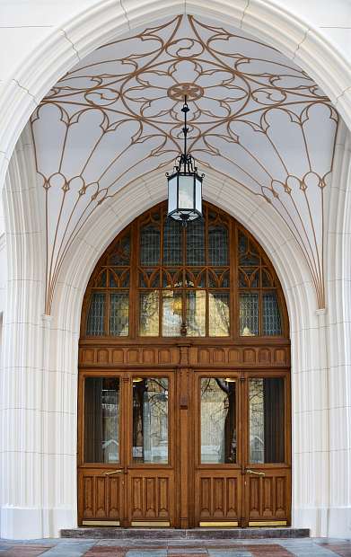 Входная группа выглядит как введение в интерьер. Здесь готика проявляется в чистом виде: стрельчатая арка, переплетение линий на своде, массивная деревянная дверь с мелкой разбивкой стекла. В реальности это воспринимается как момент «переключения». Улица остаётся снаружи, а внутри начинается более замкнутая, насыщенная среда. На фото видно, что декоративная сетка на своде не повторяет исторические образцы напрямую. Она скорее напоминает фантазийный орнамент, который держит общий ритм.