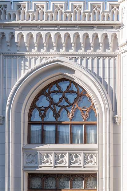 Особняк Морозова на Спиридоновке демонстрирует самый узнаваемый вариант. Фасад выстроен на стрельчатых окнах, дробных ритмах и декоративных нишах. Из-за этого кажется, что дом ближе всего к неоготике. Но внутри готические черты превращаются в тематический слой, который соседствует с мотивами других эпох. Дерево, резные детали, витражи и насыщенные цвета создают ощущение намеренно собранного художественного мира, в котором «готичность» читается не как строгий стиль, а как часть общей игры с историей.