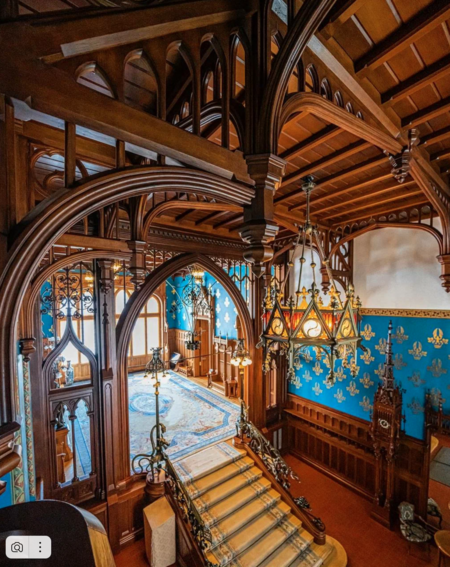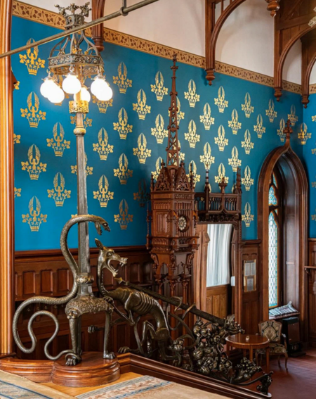 Внутренние комнаты особняка воспринимаются спокойнее, чем фасад, но готические мотивы всё равно заметны. Например, в некоторых залах сохранились витражные окна. На фото видно, что орнамент там строгий и геометричный, цветовые акценты держатся в рамках холодной палитры. Такой тип витражей чаще связывают с североевропейской традицией, где фигуративных изображений почти нет, а композиция строится на сетке.