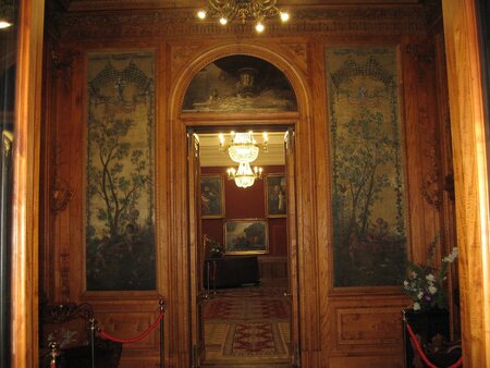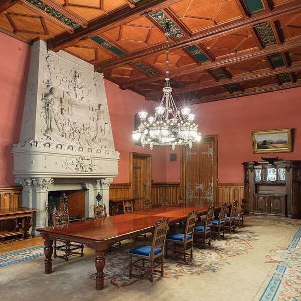 Часть интерьеров основана на тонкой работе с деревом. Стеновые панели насыщены резьбой, где легко заметить смеси мотивов разных эпох: растительные завитки, фантазийные животные, декоративные корзины с листьями. Подобная эклектика хорошо описывает поиск «собственного» стиля в конце 19 века, дома строились как личные художественные миры.