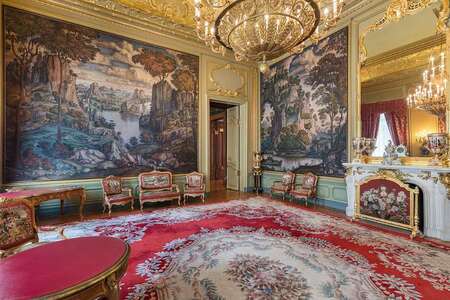 Интерьеры переходят в другой пласт стилистики. Здесь почти не остается готического характера. В парадных комнатах доминируют барочные и рокайльные мотивы: густая орнаментация, золоченые элементы, перегибы линий. Помещение строится на игре света и блеска. Потолки формируют иллюзию объёма за счет лепных углублений, а вокруг множества деталей создается богатый декоративный слой.