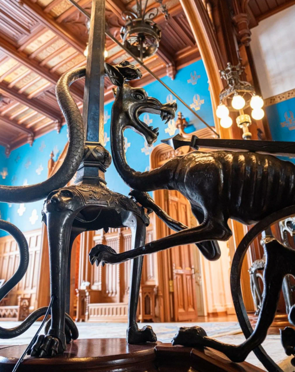 Лестничные марши выделяются металлическими фигурами, и именно они делают пространство более театральным. На крупном плане видно, что это фантазийные существа с преувеличенными силуэтами. Их формы не полностью готические это смесь, но она ощущается как часть общего настроения.