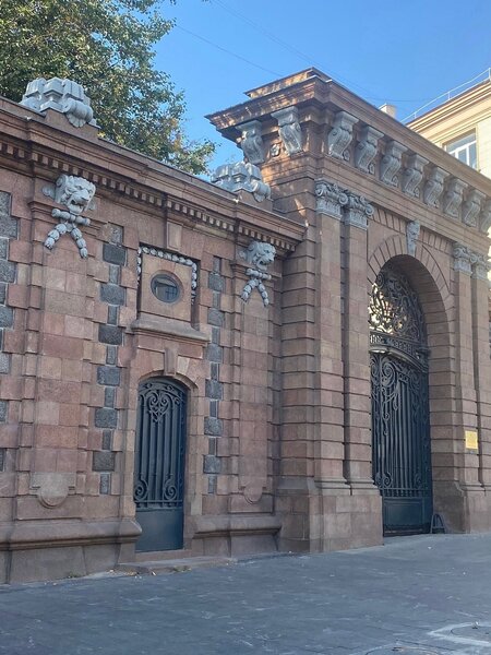 Ворота особняка это арка построена на чередовании крупных блоков, и это создаёт эффект глубины. Над проёмом размещён каменный мужской маскарон, который воспринимается почти как страж входа. Под ним сложная кованая решётка с закруглёнными линиями и растительными элементами. Интересно, что кованый узор здесь не выглядит легким, как в модерне. Он тяжёлый, плотный, будто сделан специально для того, чтобы поддержать общий суровый ритм здания.